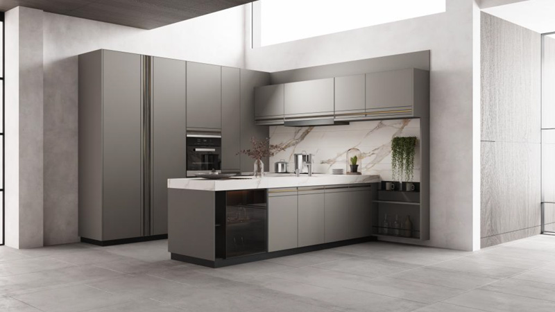 注重形式与细节的一体性,选用喷粉材质,玩转极致艺术空间。沿墙面一字排开的高柜设计连接大理石饰面纹理,集收纳与烹饪于一体的新社交空间开放式地柜,大理石与喷粉颗粒纹理营造舒适自然的社交氛围。