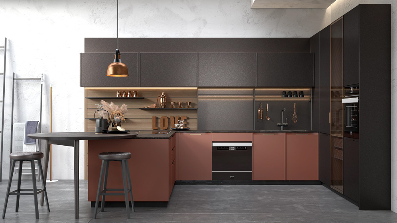极简风格的“贝伦斯”门板造型新颖独特,整体效果协调美观,橙红色门板与玻璃柜门相搭配,犹如平静沉稳的乐曲中出现的高音,产品质感格调瞬增。