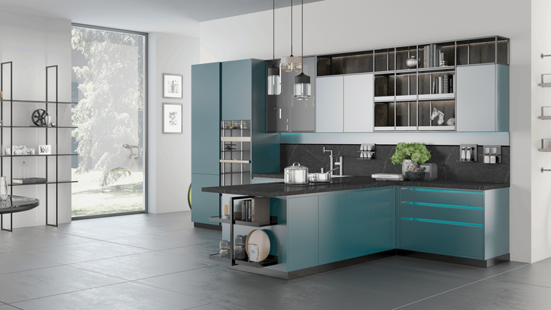 门柜、开放架、金属挂件的比例把握强化了空间层次及丰富了功能性,典雅的工业风风格,都市治愈系主色珊瑚蓝带来一份宁静和闲适。